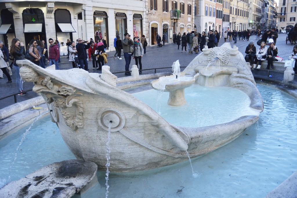 In piazza di Spagna, ai piedi della scalinata di Trinità dei Monti, si trova una delle fontane più famose di Roma. La Fontana della Barcaccia fu costruita tra il 1626 e il 1629 da Pietro Bernini, su commissione di Papa Urbano VIII Barberini. Era la prima volta che una fontana veniva concepita interamente come un’opera scultorea. Secondo una versione popolare molto accreditata, la sua particolare forma potrebbe essere stata ispirata dalla presenza sulla piazza di una barca in secca, portata fin lì dalla piena del Tevere del 1598 (nel cui ricordo il papa potrebbe aver commissionato l’opera), ma si è anche avanzata l’ipotesi che quel luogo fosse anticamente utilizzato come piccola naumachia (le famose battaglie navali di epoca antica).